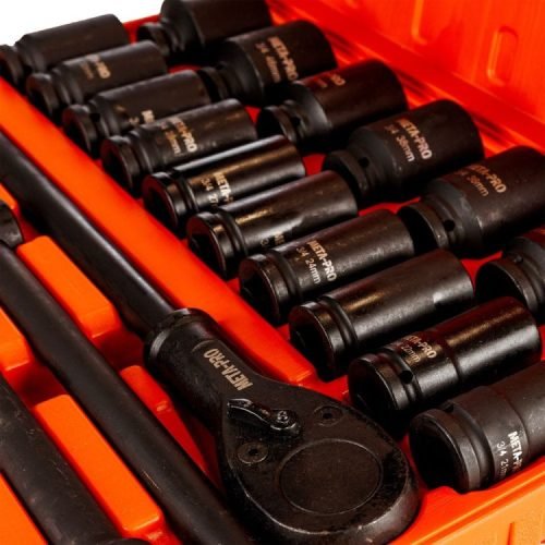 Ez a professzionális META-PRO 3/4″-os készlet autószerelő műhelyek, teherautó-szervizek és ipari munkák számára készült. A CR-V acélból készült burkolatok nagy szilárdságot és ellenállást garantálnak a nagy terhelésekkel szemben, a mellékelt tartozékok pedig növelik a kényelmet és a munkalehetőségeket.